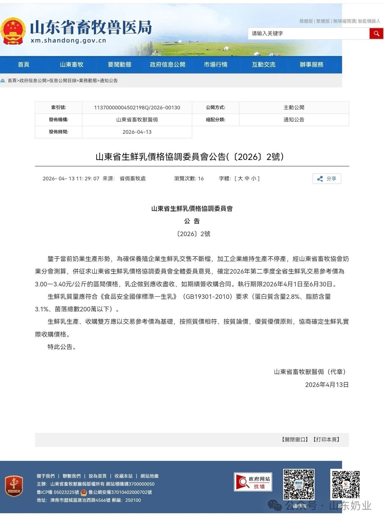 鉴于当前奶业生产形势,为确保养殖企业生鲜乳交售不断档,加工企业维持生产不停产,经山东省畜牧协会奶业分会测算,并征求山东省生鲜乳价格协调委员会全体委员意见,确定2026年第二季度全省生鲜乳交易参考价为3.00—3.40元/公斤的区间价格,乳企做到应收尽收、如期续签收购合同。执行期限2026年4月1日至6月30日。