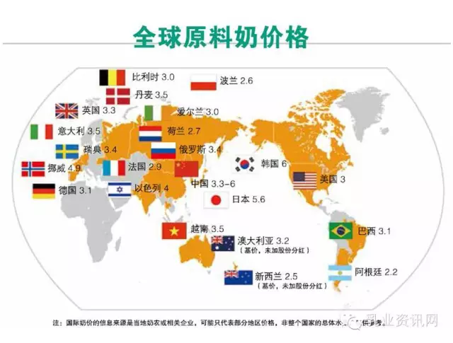 全球经济一体化不可阻挡,尤其在2014年中澳自由贸易协定的签订后,奶业的发展必将面临全球化。然而,根据2014年8月全球原料奶价格统计可以看出,中国原料奶价格居高,为3.3-6rmb/kg,明显高于世界其他地区3-4rmb/kg的价格。因此,国际市场低价格乳制品的进口给国内奶业带来了很大的冲击。